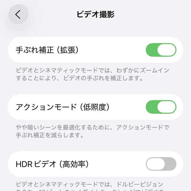 ビデオ撮影よりアクションモード(低照度)をタップしてオンに切り替えます(画像はオンの状態)。
