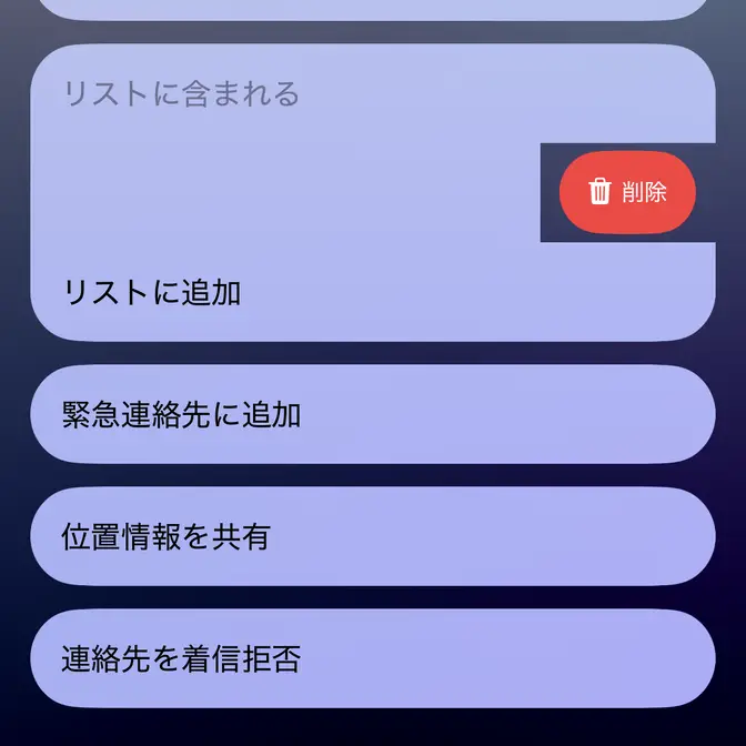 リストから除く場合、対象の連絡先の対象のリストを右から左へスワイプし削除をタップします。