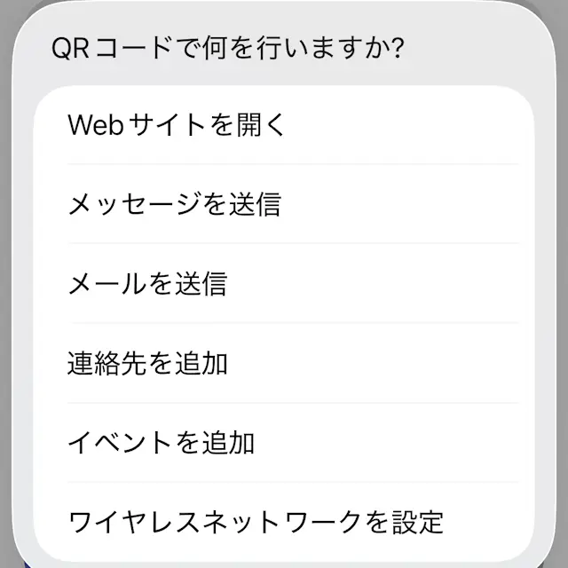 ショートカットアプリのライブラリよりQRコードを作成するをタップし、メニューより連絡先を追加をタップします。