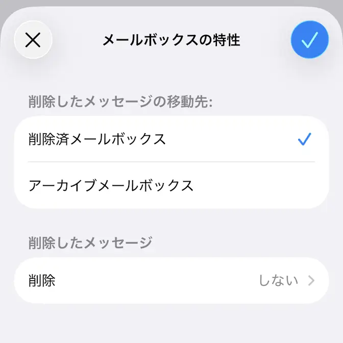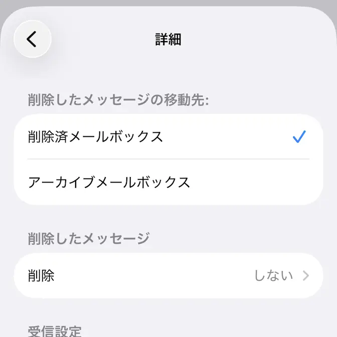 一般的に受信メールを削除すると[ゴミ箱]に移動し一定期間ののちに削除されるようになっていますが、iPhoneでは削除するまでの期間を選択できるようになっています。