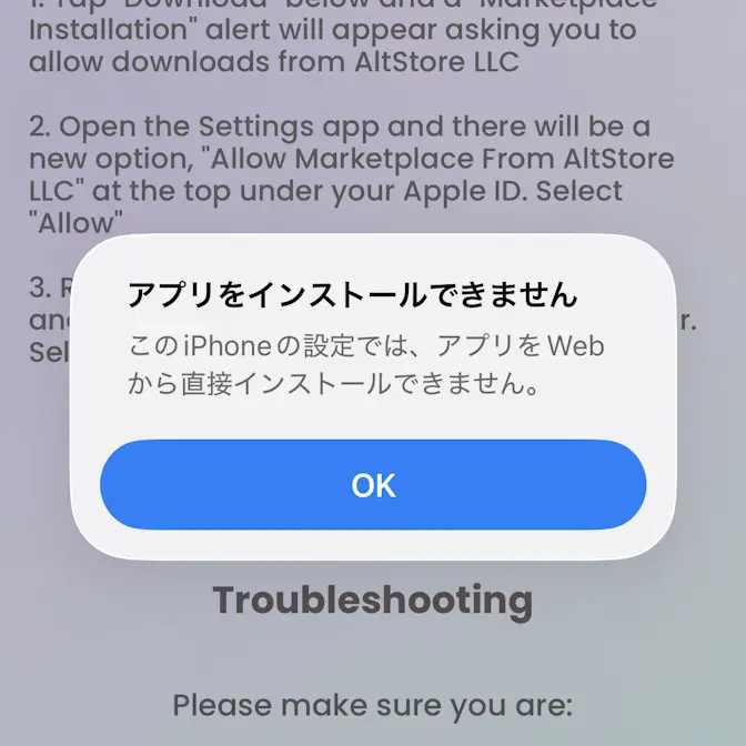私のiPhoneでは、Safariブラウザよりダウンロードをしたところアプリをインストールできません – このiPhoneの設定では、アプリをWebから直接インストールできませんと表示され、インストールすることができませんでした。