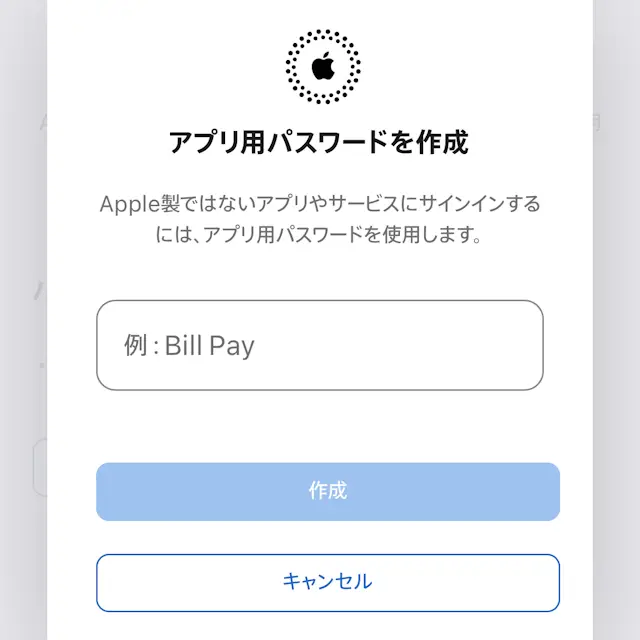 アプリ用パスワードの+より任意の名前を入力し作成をタップします。