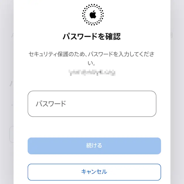 パスワードを確認が表示されたらApple Accountのパスワードを入力し続けるをタップします。また、アプリ用パスワードを作成できませんでしたなどと表示されたらパスワードでサインインをタップしてやり直します。