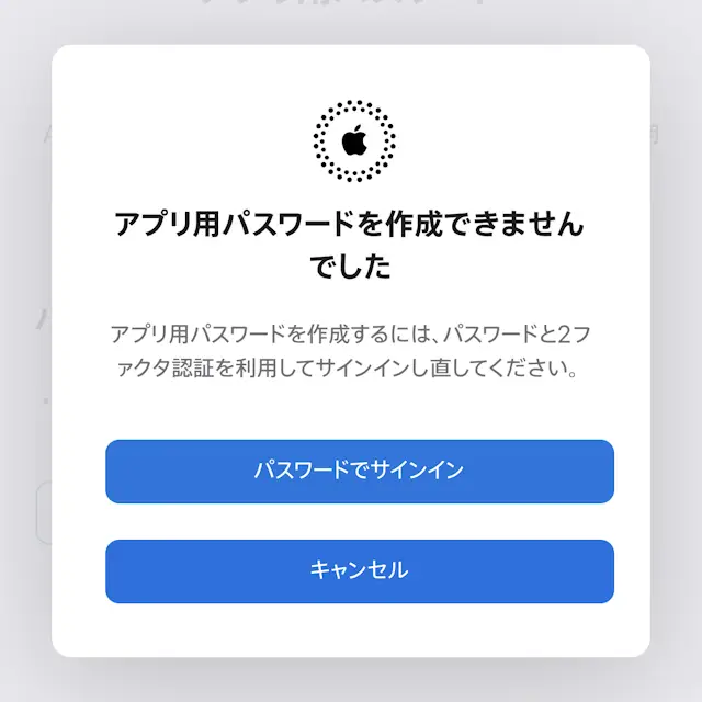 何らかのアプリやサービスにApple Accountを使用する際、正しいはずのApple Accountのパスワードを入力してもサインインできないのであれば、アプリ用パスワードの作成が必要な場合がほとんどです。