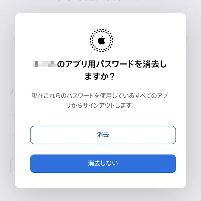 iPhoneアプリ→Safari→Apple Account→サインインとセキュリティ→アプリ用パスワード→アプリ用パスワードを消去しますか?