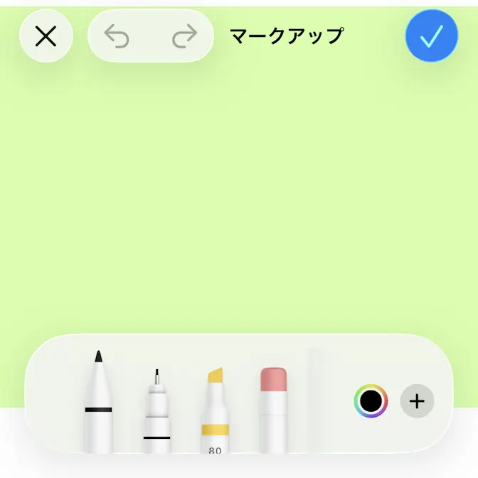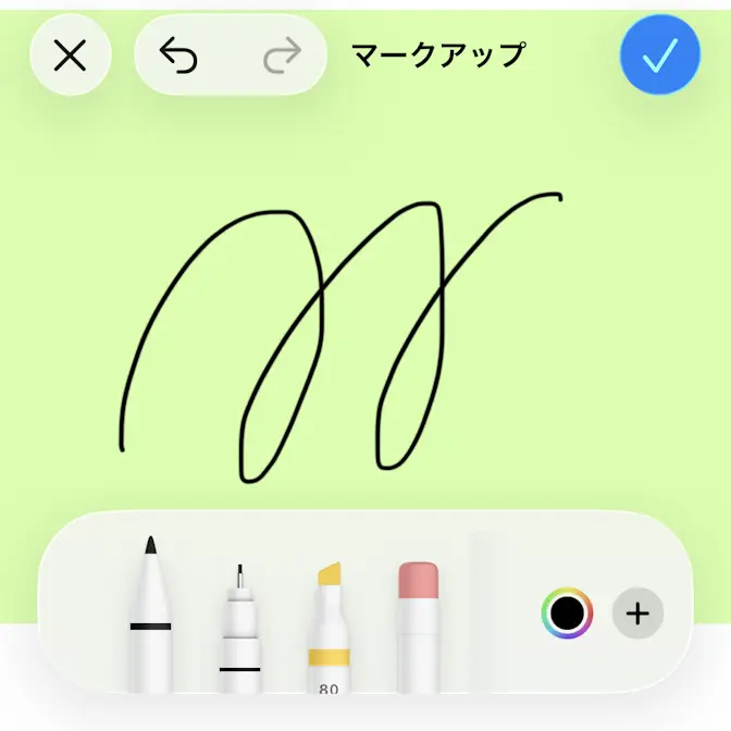編集のマークアップより、ペンのサイズやカラーは選択して書き込みを行います。