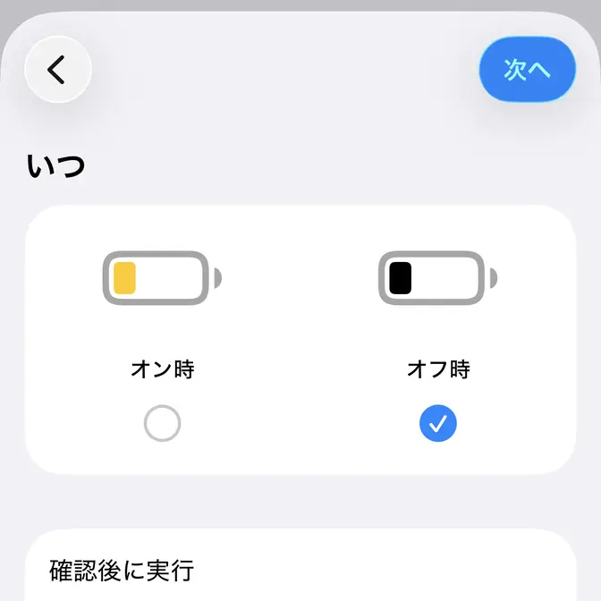 低電力モードよりオフ時のみにチェックし次へ>新規ショートカットを作成をタップします。