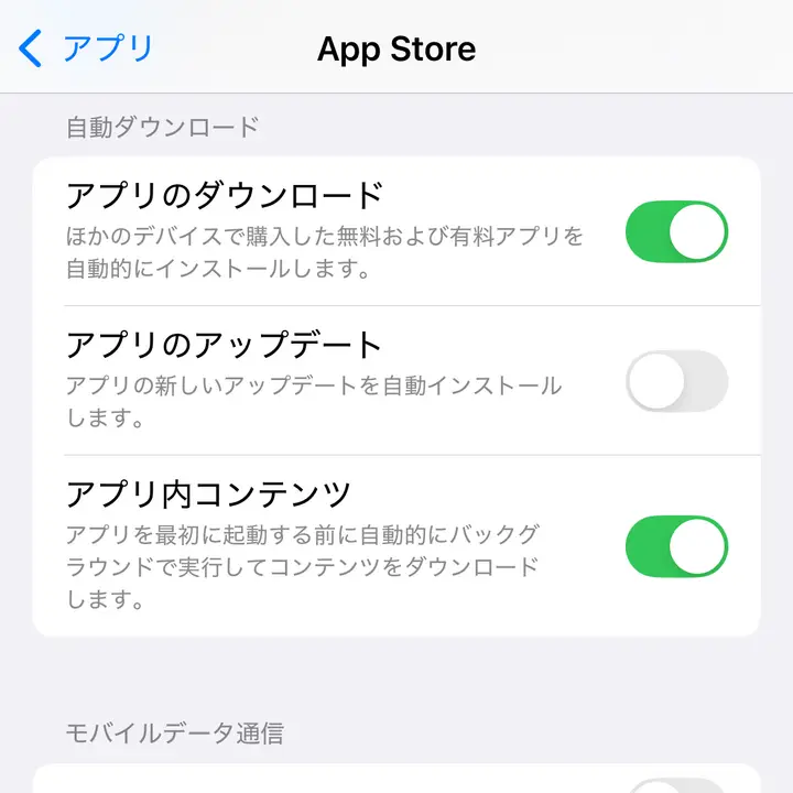 App Storeよりアプリのアップデートをオフに切り替えます(画像はオフの状態)。