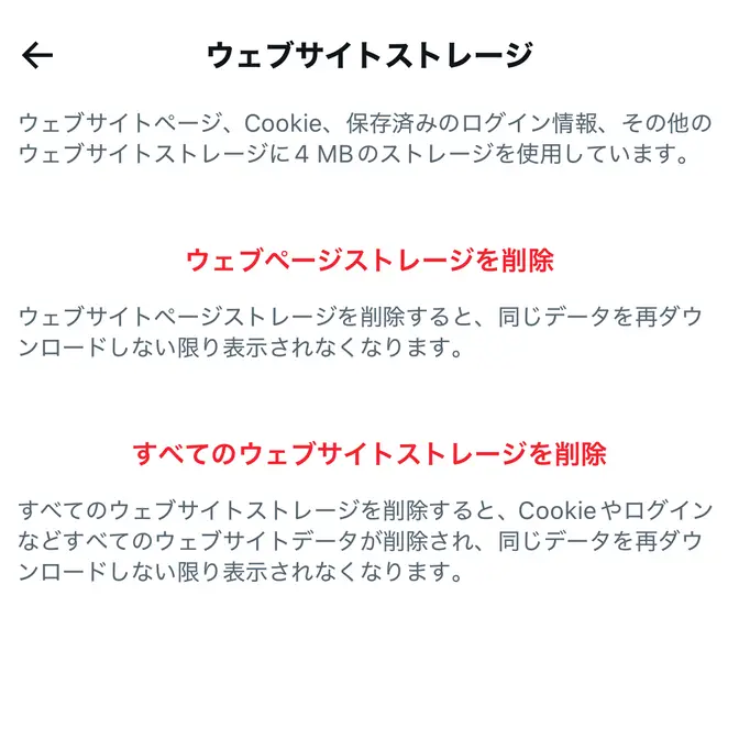 データ利用の設定のウェブサイトストレージよりウェブページストレージを削除をタップします。