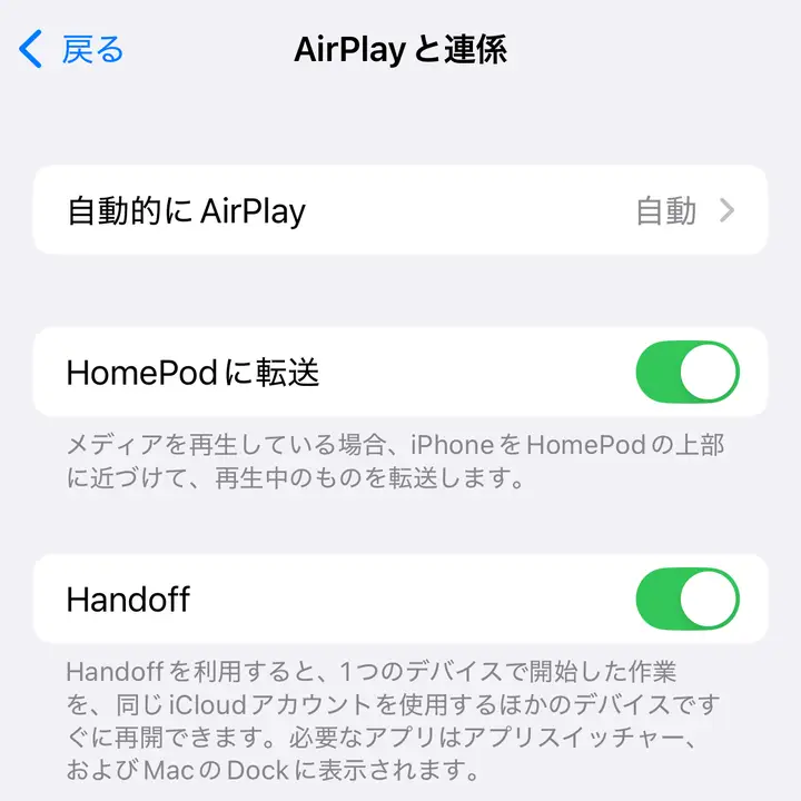 - AirPlayと連係よりHandoffのオン/オフを切り替えます。