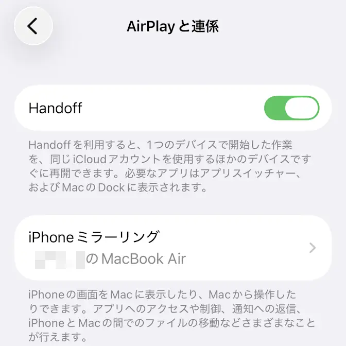 AirPlayと連係よりHandoffのオン/オフを切り替えます。