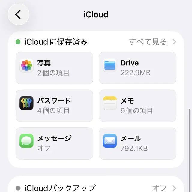 iCloudのiCloudに保存済み>すべて見るより対象の項目をオンに切り替えます(画像はオンの状態)。