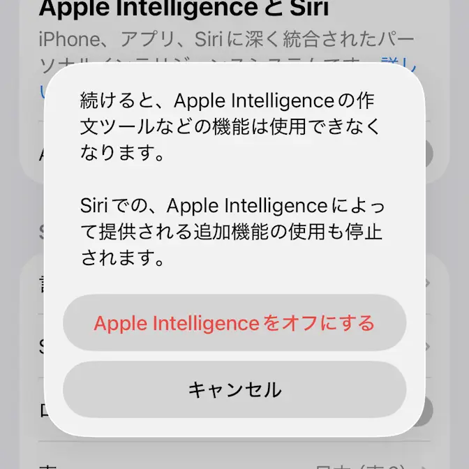 確認画面よりApple Intelligenceをオフにするをタップするとオフになります。
