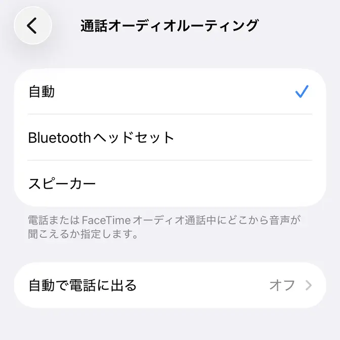 タッチの通話オーディオルーティングより自動で電話に出るをタップします。