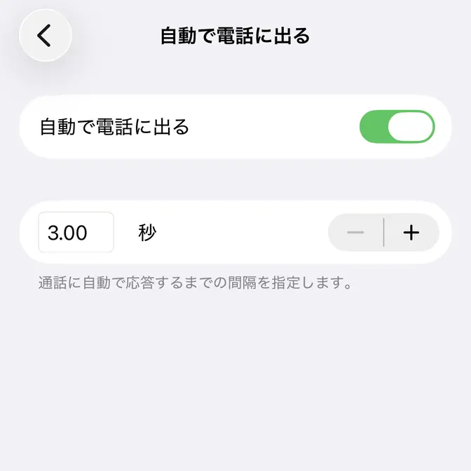 “自動で電話に出る”より自動で電話に出るをオンに切り替え(画像はオンの状態)、-/+で自動で応答するまでの時間を変更します。