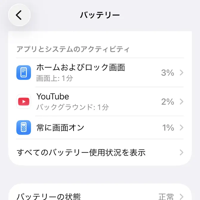 バッテリーのアプリとシステムのアクティビティよりバッテリーの使用状況を確認します。