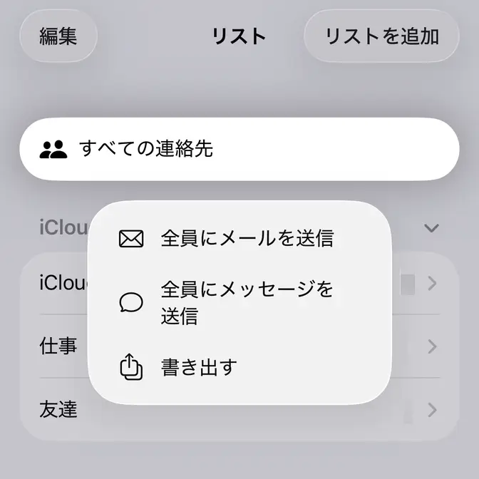 リストよりすべての連絡先を長押しし書き出すをタップします。