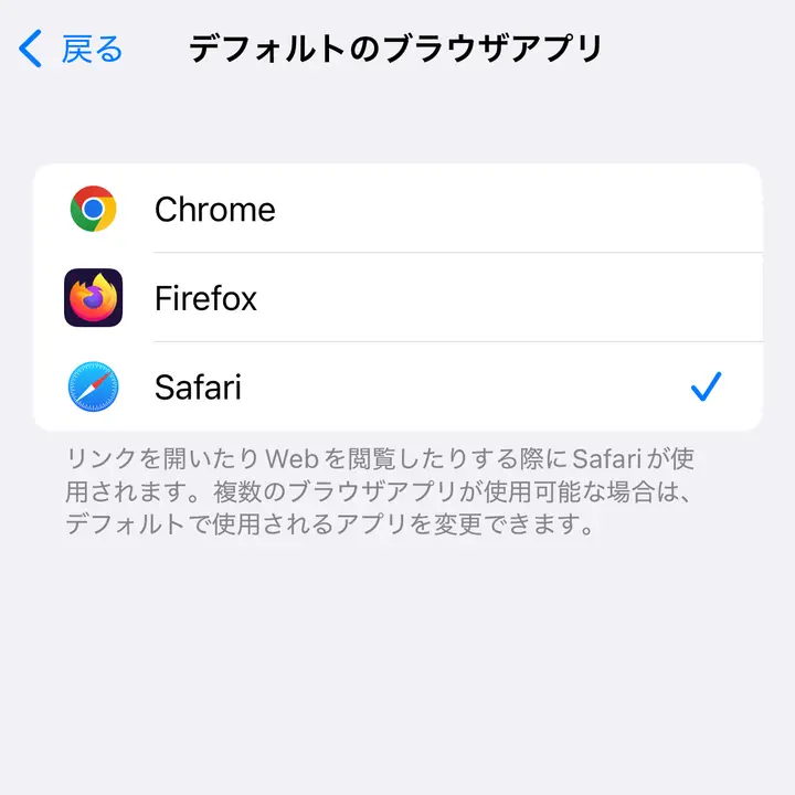 iPhone→設定→アプリ→デフォルトアプリ→デフォルトのブラウザアプリ