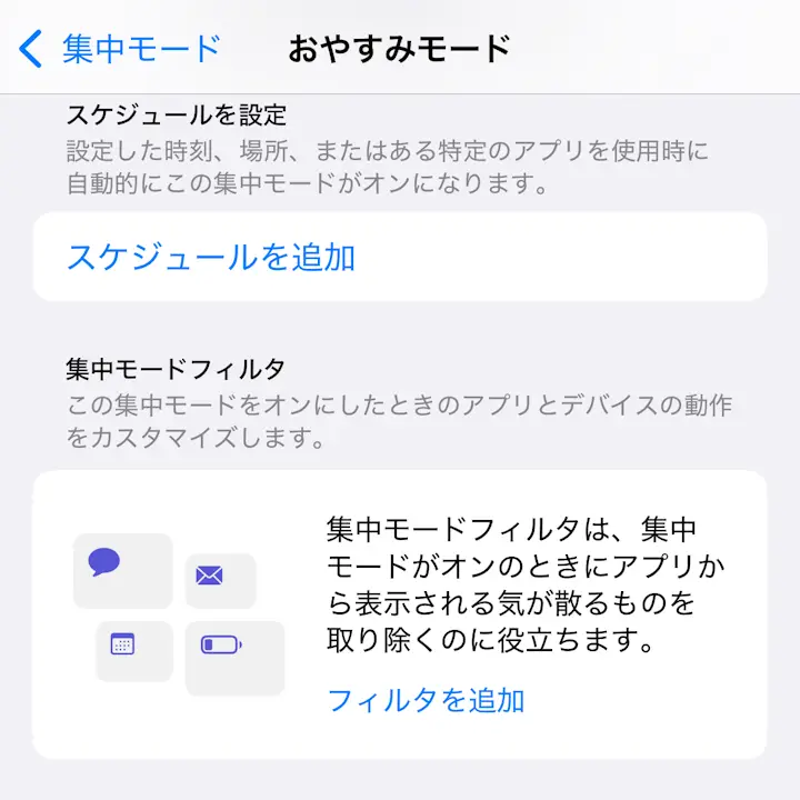 指定した時刻の間だけ着信や通知の音やバイブレーションを鳴動させない機能をおやすみモードと呼び、iPhoneでは集中モードの1つになっています。