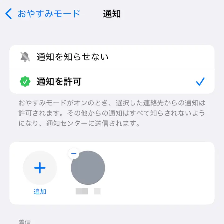 おやすみモードの連絡先/アプリより通知を知らせない/通知を許可を選択します。