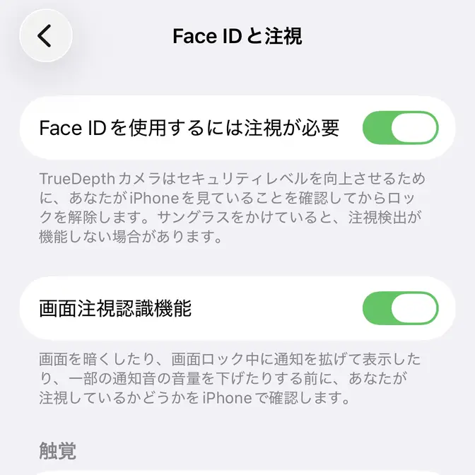 ただ、オフにする場合には誤作動を防止するため、Face IDのFace IDを使用するには注視が必要と組み合わせると良いでしょう。