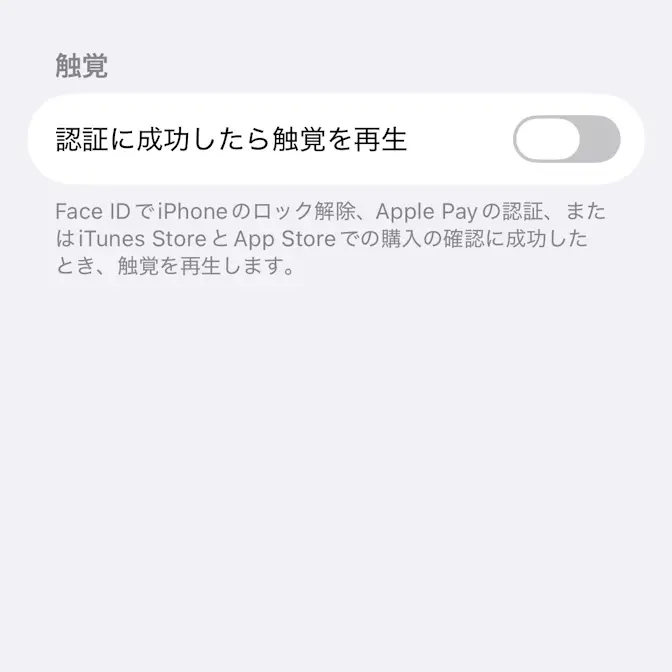 “Face IDと注視”より認証に成功したら触覚を再生をオフに切り替えます(画像はオフの状態)。