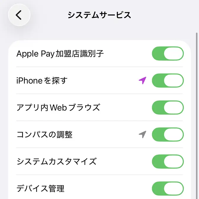 iPhone→プライバシーとセキュリティ→位置情報サービスiPhone→プライバシーとセキュリティ→位置情報サービス→アプリ→システムサービス