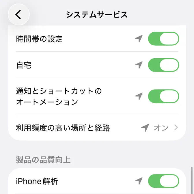 iPhone→プライバシーとセキュリティ→位置情報サービス→アプリ→システムサービスiPhone→プライバシーとセキュリティ→位置情報サービス→アプリ→システムサービス→利用頻度の高い場所と経路