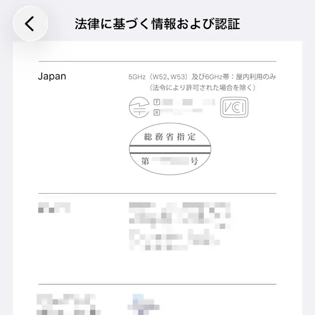 もちろん、いちいちモデル番号で調べるのは面倒なので、設定より法律に基づく情報および認証を表示して確認するのが早いでしょう。