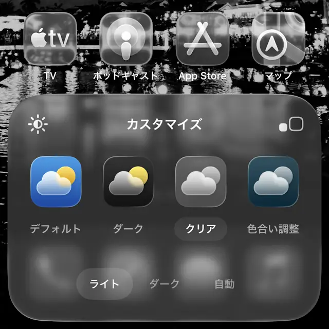 アイコンのカスタマイズはiOS 26でクリアが追加されたことでデフォルトダーククリア色合い調整から選択できます。