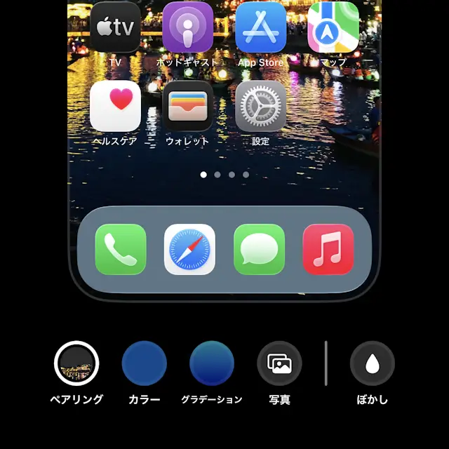 iPhone→ホーム→編集→カスタマイズ→クリア→ダークiPhone→ホーム→編集→カスタマイズ→クリア