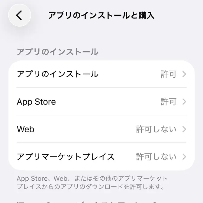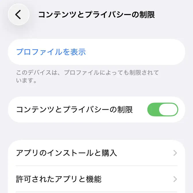 コンテンツとプライバシーの制限のコンテンツとプライバシーの制限をオンにし、アプリのインストールと購入よりアプリのインストールをタップします。