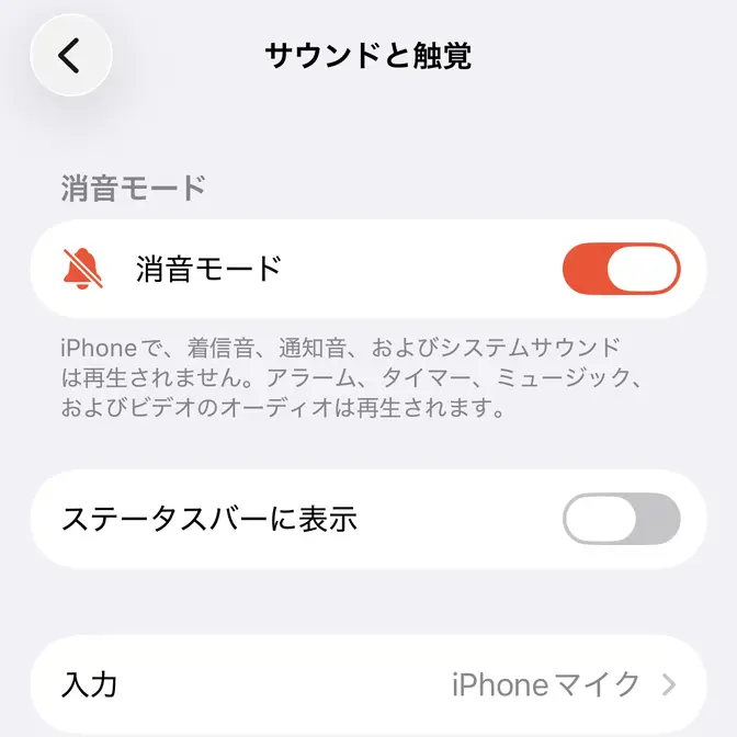 設定のサウンドと触覚よりステータスバーに表示をオフに切り替えます(画像はオフの状態)。
