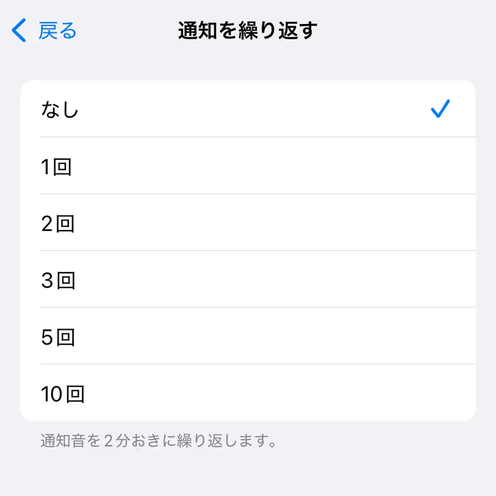 これは、「未確認の通知を2分ごとに指定した回数だけ繰り返す」と言う機能で、通知を確認せずに放置した時のみ動作するので「通知に気が付かなかった」「通知を確認し忘れた」と言ったことを防ぐ効果があります。