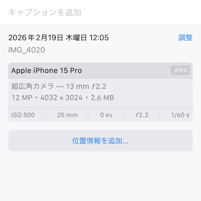 保存されるデータは、冒頭に記した情報のほかにサイズ(幅x高さ)サイズ(容量)撮影場所などがあります。