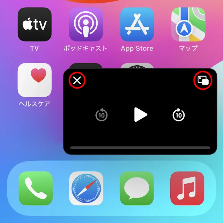 終了するには×、元に戻すには(PIPのボタン)をタップします。