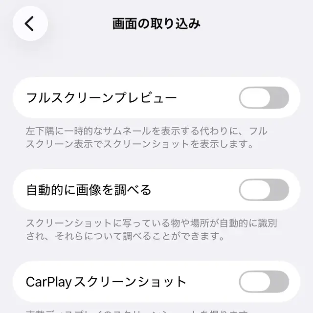 画面の取り込みよりフルスクリーンプレビューをタップしてオフに切り替えるとサムネイルで表示されるようになります(画像はオフの状態)。
