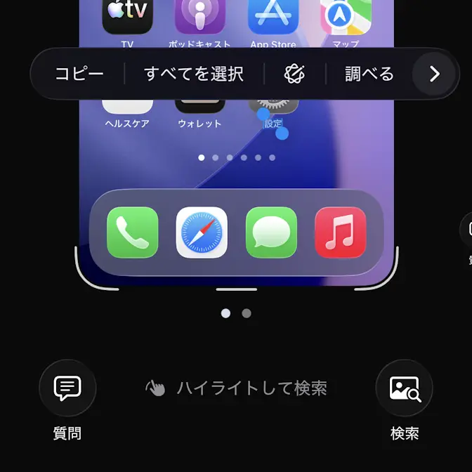 フルスクリーンプレビューより対象のテキストを長押しして選択しコピーをタップします。