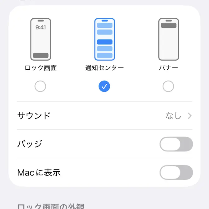 また、任意でロック画面通知センターバナーバッジのオン/オフを切り替えると良いでしょう。