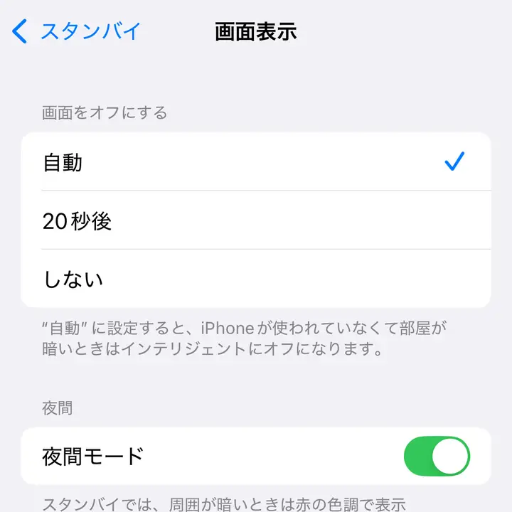 - スタンバイの画面表示より画面をオフにするを選択し、夜間モード動かすとスリープ解除のオン/オフを切り替えます。