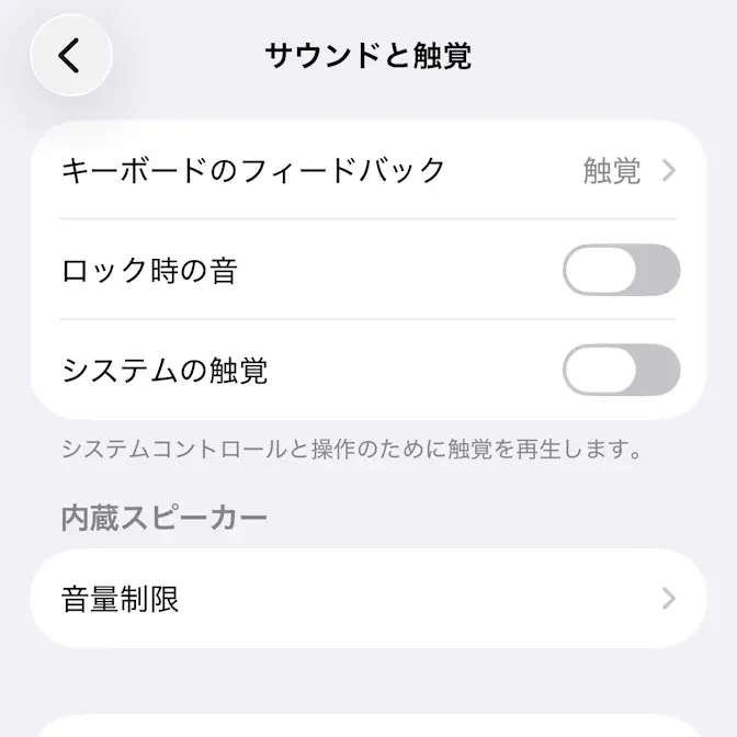 設定のサウンドと触覚よりシステムの触覚をオフに切り替えます(画像はオフの状態)。