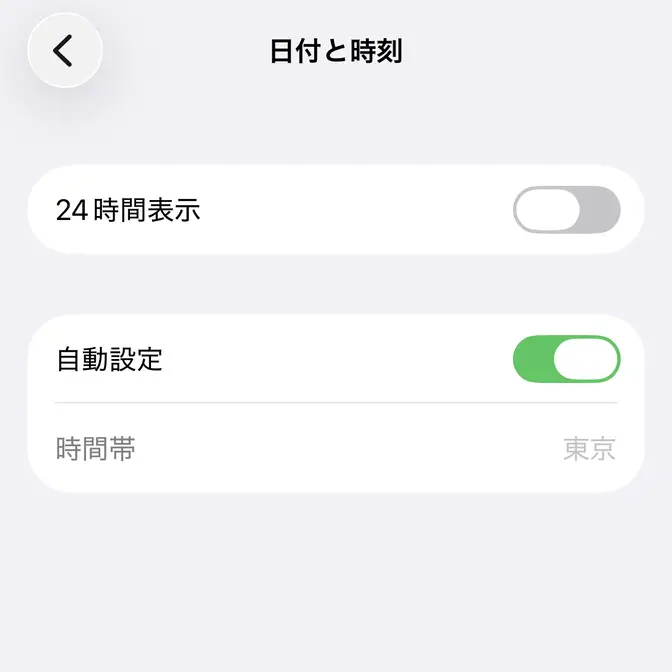日付と時刻より24時間表示オフを切り替えます(画像はオフの状態)。