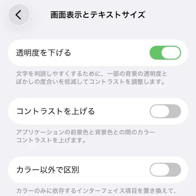 画面表示とテキストサイズより透明度を下げるをタップしてオンに切り替えます(画像はオンの状態)。