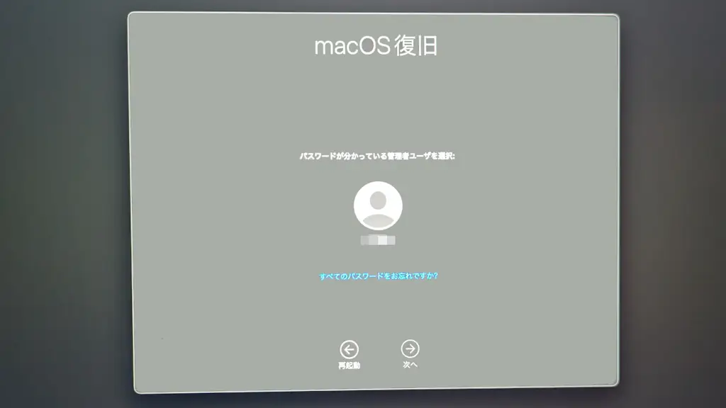 macOS復旧より管理者ユーザー>次へを選択しパスワードを入力します。