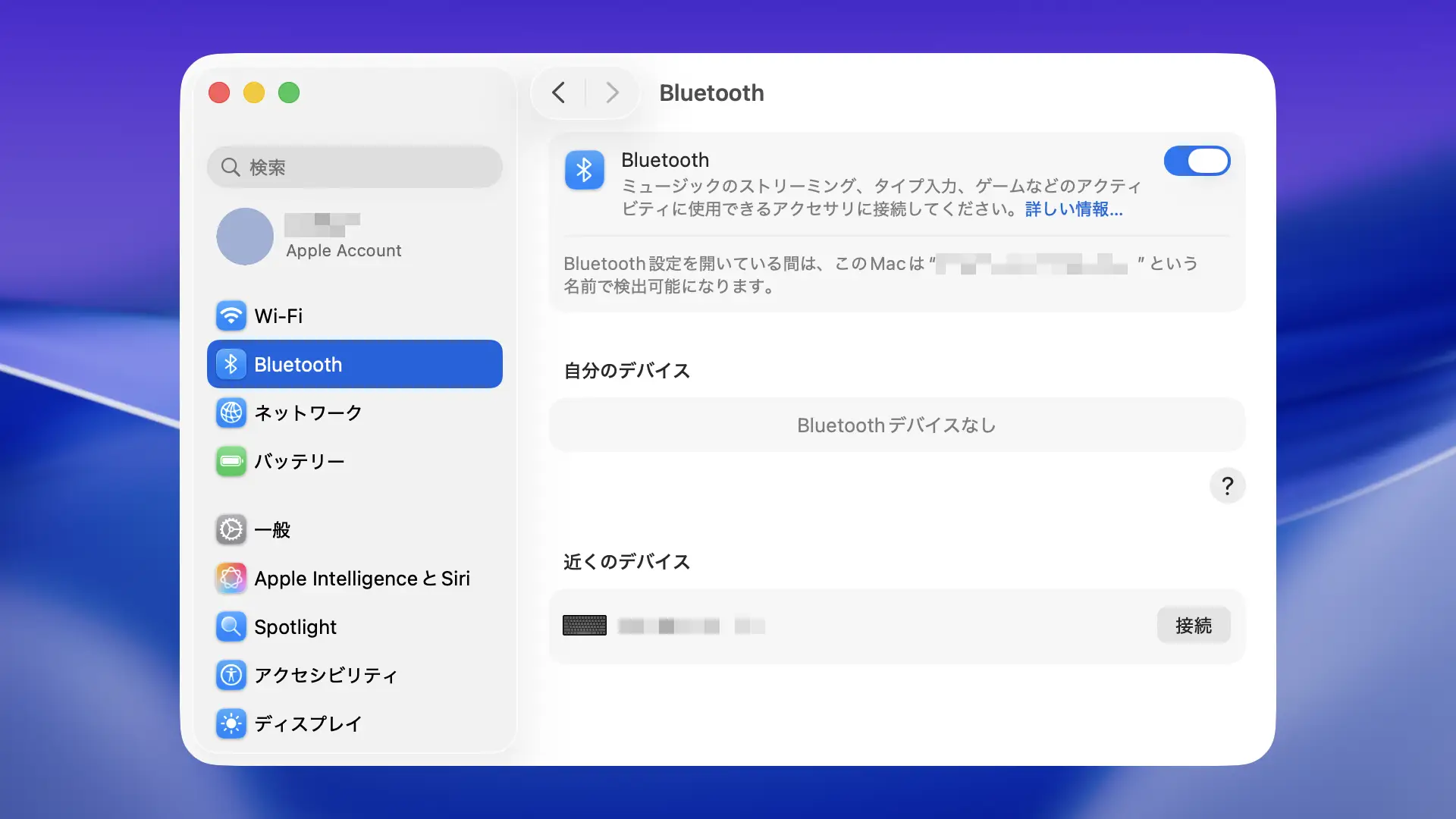 Bluetoothの近くのデバイスより対象デバイスにマウスポインタを合わせ接続をクリックします。