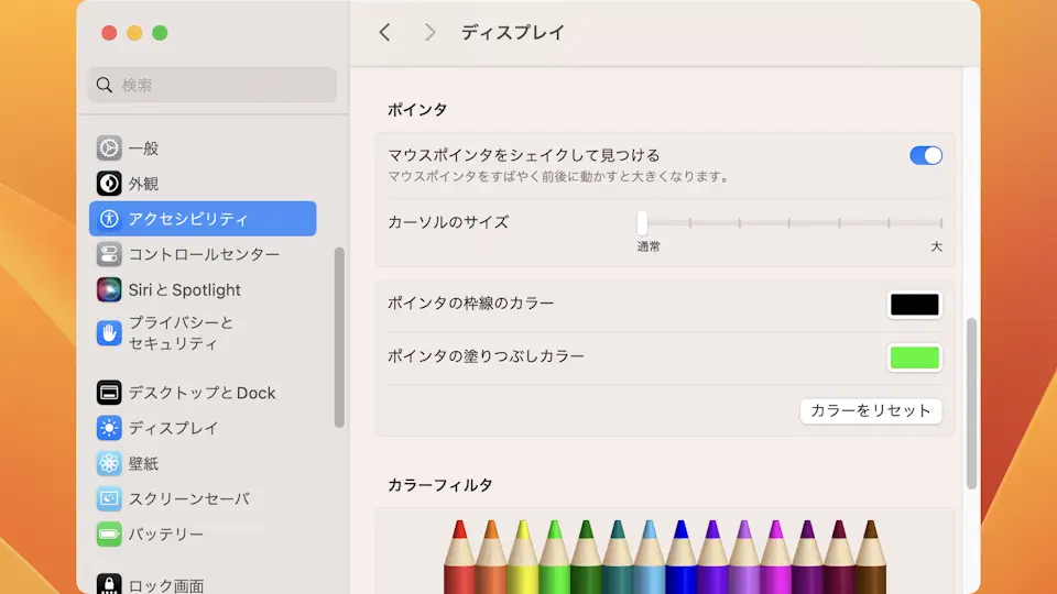 マウス操作時に表示される【マウスポインタ(矢印)】は意外にも「現在位置が分からない」となりがちです。Macでは「色を変える」と言った装飾することができるので、見失うことが多ければ目立たせると良いでしょう。