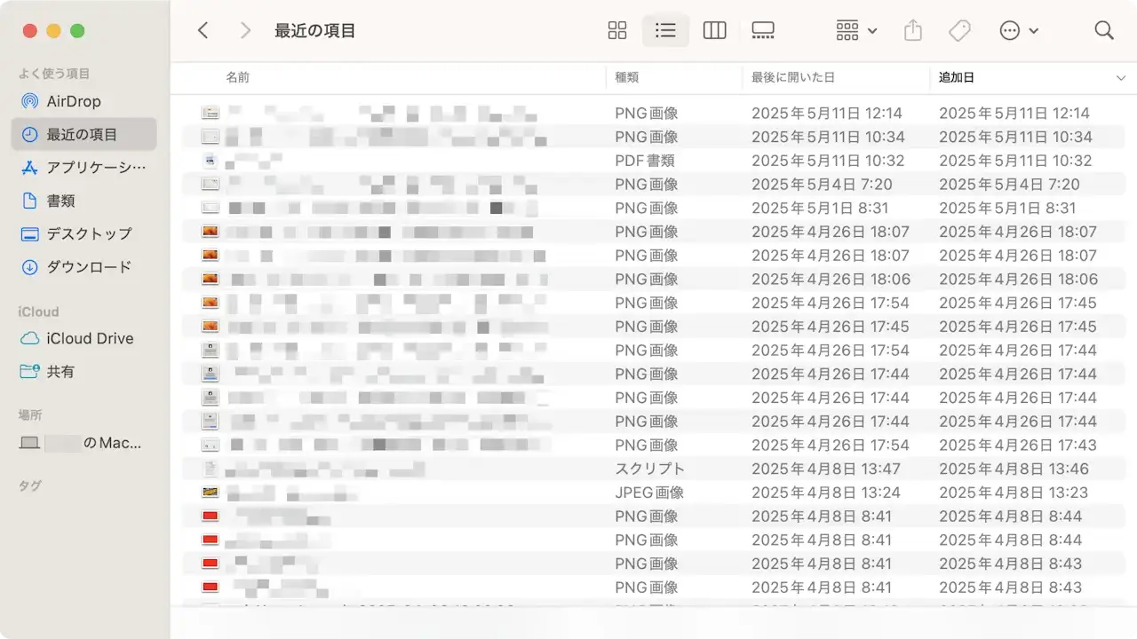 MacのFinderでレイアウトを【リスト表示】にすると、カラム(列)に[名前][日付時刻]などが表示されますが、これらの項目は追加/削除できます。