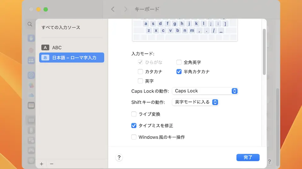 すべての入力ソースの日本語 – ローマ字入力よりShiftキーの動作を英字モードに入るに変更します。