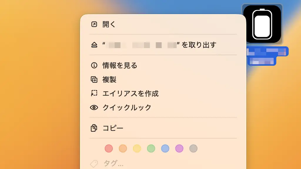 デスクトップより(対象のAppleディスクイメージ)を右クリックし、メニューより(対象のファイル名)を取り出すをクリックします。