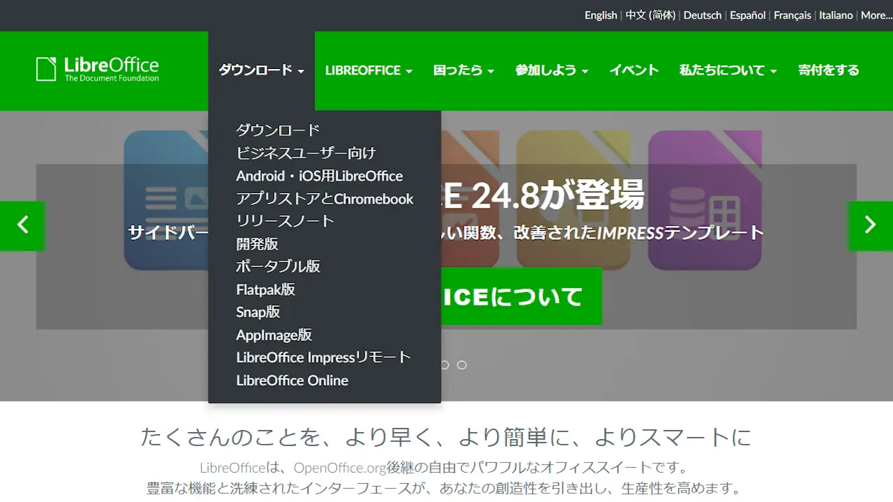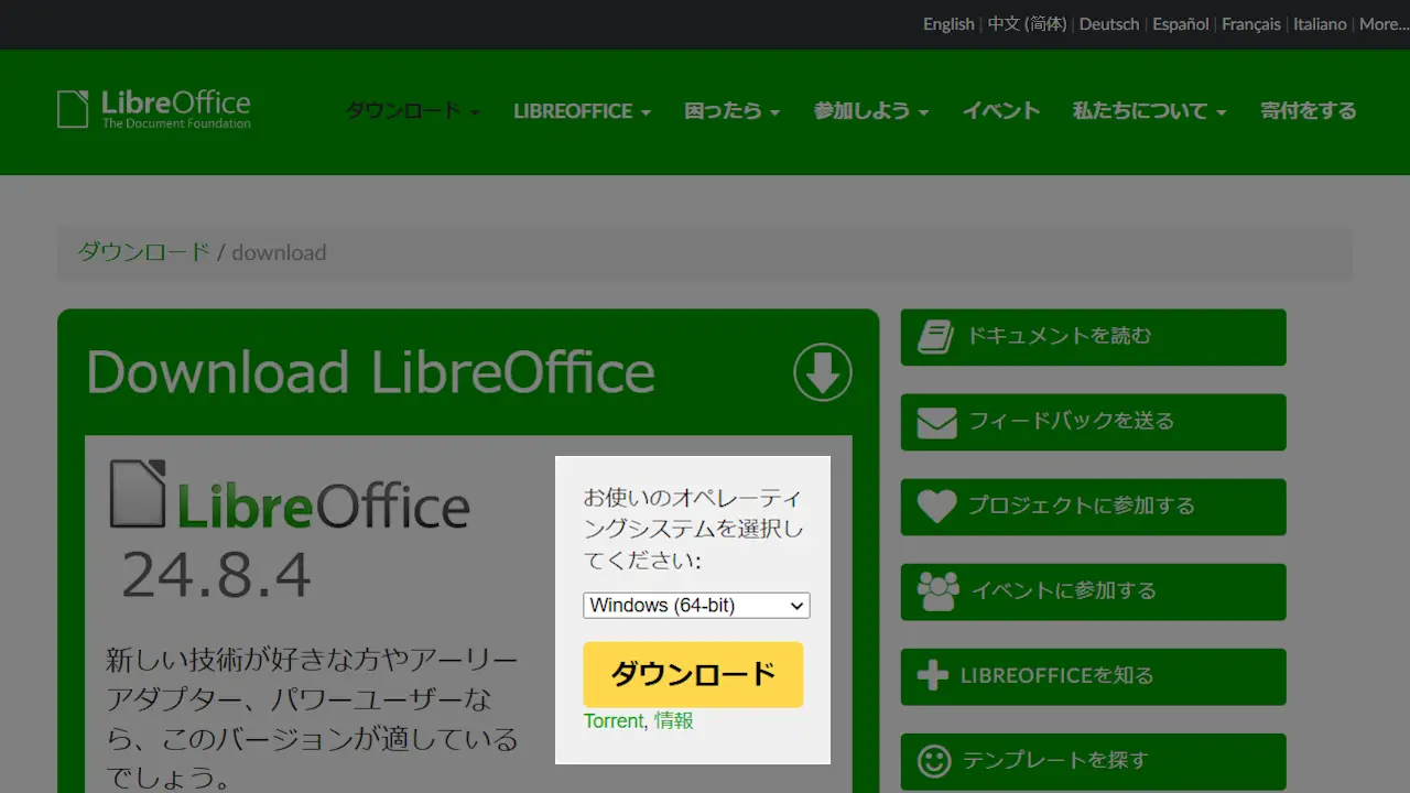 Webブラウザより“LibreOffice”にアクセスしダウンロードよりダウンロードをクリックします。